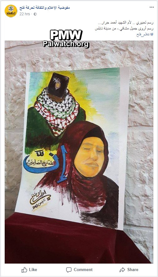 Posted text: “A drawing of the mother of Martyr (Shahid) Ahmed Jarrar (i.e., terrorist, led murder of 1)