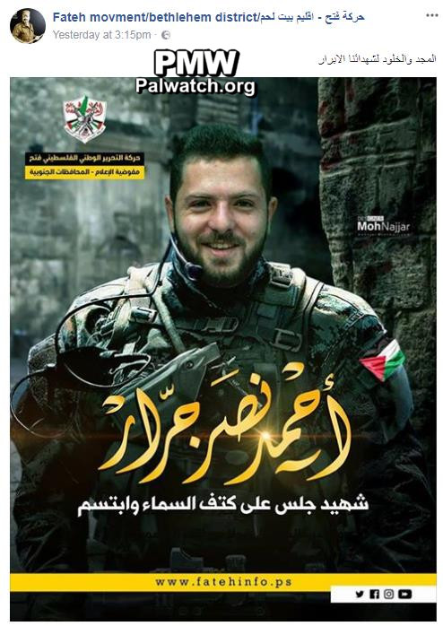 "The national action factions eulogized Martyr (Shahid) Ahmed Nasr Jarrar (i.e., terrorist, responsible for murder of 1), who was assassinated (sic., Jarrar was killed in an exchange of fire while resisting arrest) by a force from the occupation army and its special units yesterday [Feb. 6, 2018] in the town of Al-Yamun, in the Jenin district. Fatah Movement Spokesperson Osama Al-Qawasmi said that the crime of the assassination of young Jarrar early yesterday morning joins the crimes of the occupation, which are in contradiction of all of the international laws...