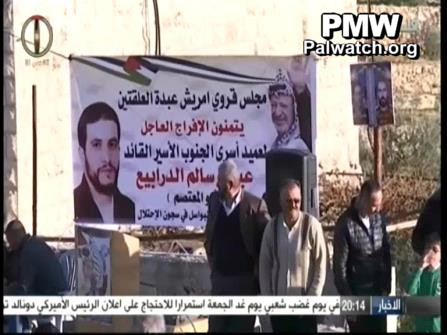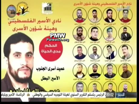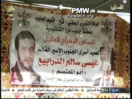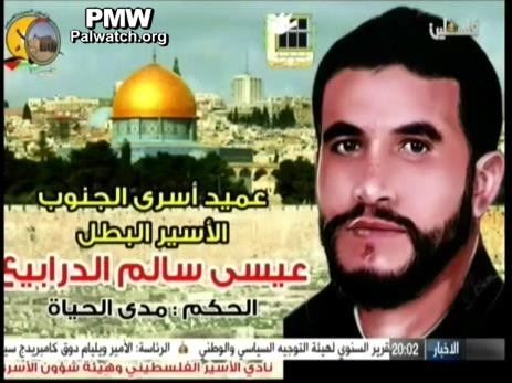 Text on the left of the poster: “The Palestinian [PA-funded] Prisoners’ Club and the [PLO] Commission of Prisoners’ Affairs; Verdict: Life sentence; Most senior of the prisoners of the south, heroic prisoner Issa Salem Darabi