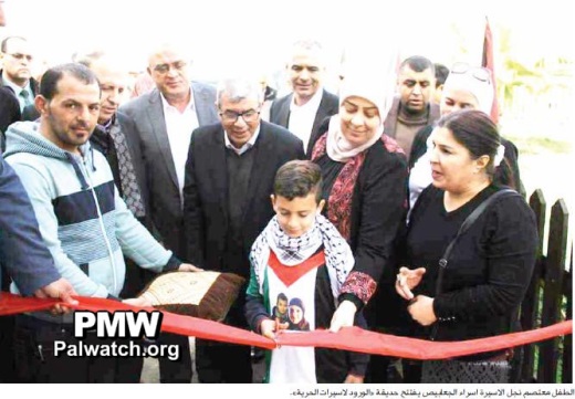 Director of [PLO] Commission of Prisoners' Affairs Issa Karake said: 'This activity is taking place as part of the loyalty to the female Palestinian prisoners sitting in the occupation's prison, and as a sign of solidarity with the great sacrifices they have made for the freedom and independence of the Palestinian people. The inauguration of this park is a message to the Israelis and the entire world – we are a beautiful people that loves life and freedom, sows hope and love, and does not relinquish its right to independence and the establishment of a state.'"A picture accompanying the article shows Mu'tasim Ja'abis, son of terrorist Israa Ja'abis, cutting the ribbon at the inauguration ceremony for the new park.