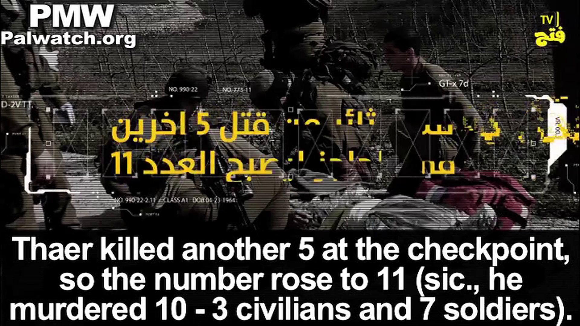 Thaer killed another 5 at the checkpoint, so the number rose to 11 (sic., he murdered 10 - 3 civilians and 7 soldiers).