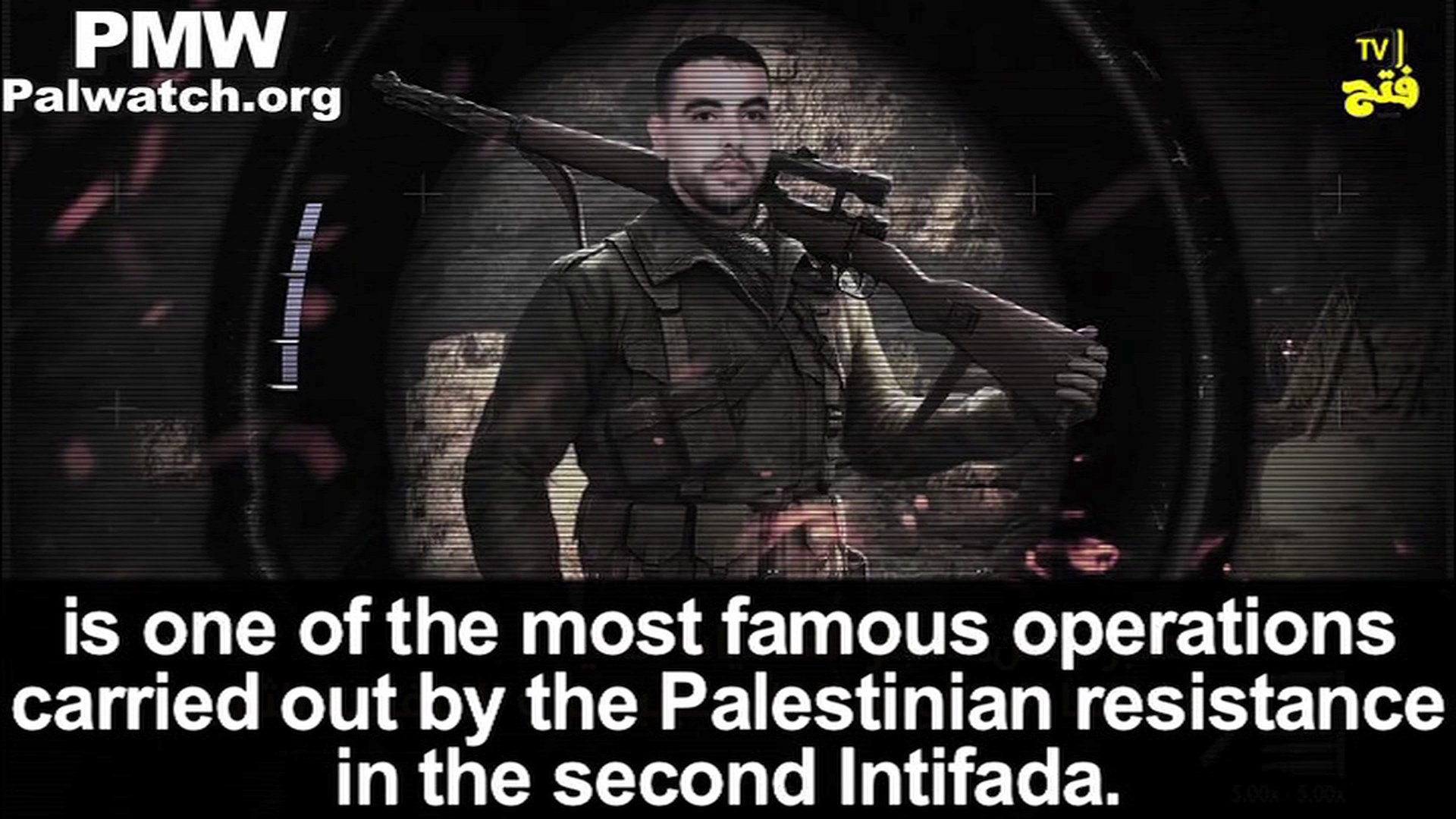 In a video posted on Facebook, Abbas' Fatah party takes pride in the murder of 10 Israelis. The video glorifies a terror attack carried out by terrorist Thaer Hammad in 2002, who shot and murdered 3 Israeli civilians and 7 soldiers one by one with a sniper rifle from a hilltop in Wadi Al-Haramiya between Ramallah and Nablus.