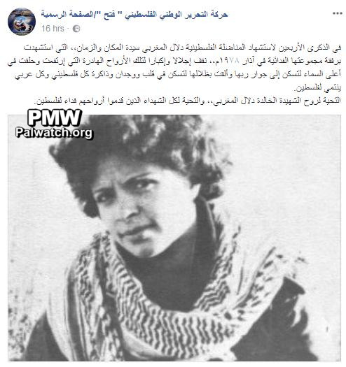 Marking the 40th anniversary of the most lethal terror attack in Israel's history in which 12 children and 25 Israeli adult civilians were murdered by Palestinian terrorists, Fatah posted a video celebrating the attack and glorifying the murderers, in particular the leader of the attack, female terrorist Dalal Mughrabi. Palestinians have referred to the hijacked bus in which most of the Israelis were murdered, as "the first Palestinian Republic," because the bus remained under the terrorists' control for a few hours, as they drove from Haifa in the north to the center of the country, while shooting at civilian cars they passed on the way.