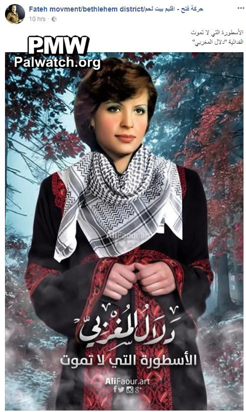 Fatah's Bethlehem branch posted two photos of terrorist Mughrabi. One, a photoshopped image, praising her as "the legend that doesn't die":