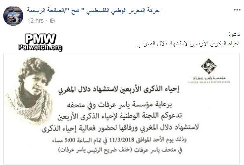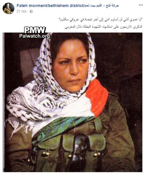 At this opportunity, the Jerusalem branch... mentioned praiseworthy Martyr Dalal Mughrabi (i.e., terrorist who led murder of 37, 12 of them children), especially in light of the approaching 40th anniversary of her death as a Martyr."