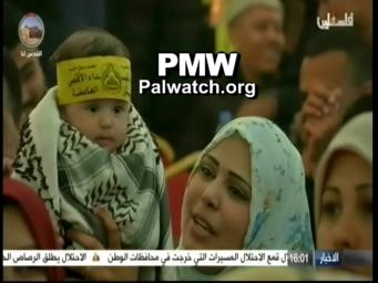 Visual: A woman is holding a baby dressed in a keffiyeh (Arab headdress) and a yellow Fatah headband.