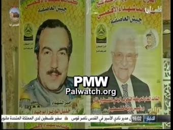 Two posters are shown; the poster on the left shows arch-terrorist Khalil Al-Wazir “Abu Jihad,” responsible for the murder of 125 Israelis; in the upper right corner is the logo of the Al-Aqsa Martyrs’ Brigades with crossed assault rifles and a grenade over the Dome of the Rock.
