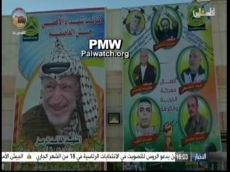 The poster on the right shows PA Chairman Mahmoud Abbas; in the upper left is the logo of the Al-Aqsa Martyrs’ Brigades, and in the upper right is former PLO and PA Chairman Yasser Arafat.