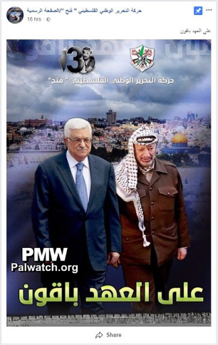 Image on official Fatah Facebook page shows Abbas and Yasser Arafat with map of "Palestine" replacing all of Israel with the text: "Fatah Movement Remaining loyal to the path"