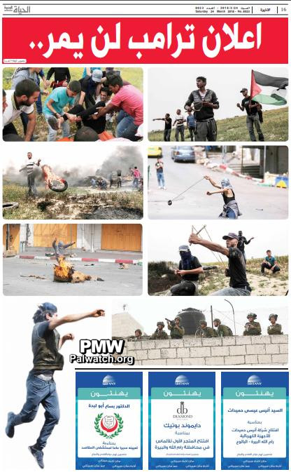 A full page of the official PA daily is dedicated to pictures of Palestinian rioters waving Palestinian flags, burning tires, throwing rocks, and using slingshots, and at the bottom right is a picture of Israeli soldiers.