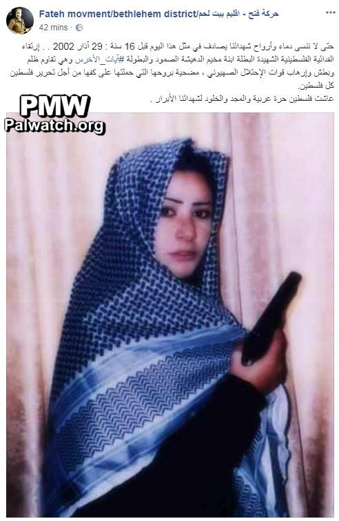 Fatah glorifies 17-year-old female suicide bomber: "The Palestinian self-sacrificing fighter and heroic martyr."