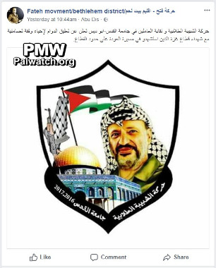 The image shows the logo of the Fatah Shabiba Student Movement at Al-Quds University. The logo shows former PLO and PA Chairman Yasser Arafat, the Dome of the Rock with a Palestinian flag above it, and the PA map of “Palestine” that presents all of Israel as “Palestine” together with the PA areas with a keffiyeh (Arab headdress) pattern on it. In front of the PA map is an AK-47 assault rifle.