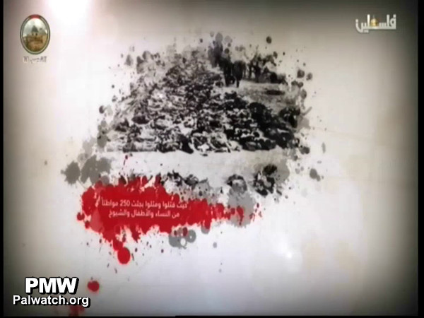 Palestinian Authority TV misrepresented a photo of concentration camp victims and Sabra and Shatila victims as Arab victims of Deir Yassin Massacre in 1948, falsely claiming the Jews "burned the women and children in the village's oven"