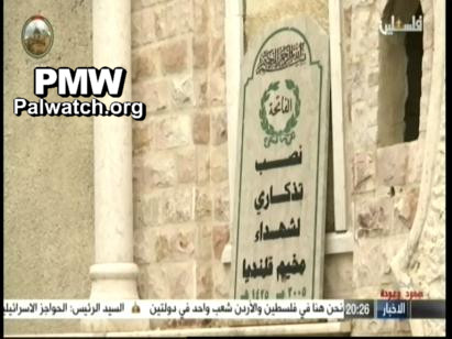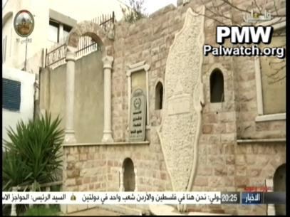 Visuals: At the opening of the program the official PA TV host stands next to a monument to the “Martyrs” of the Qalandiya refugee camp that is in the shape of the PA map of “Palestine" that presents all of Israel as "Palestine" together with the PA areas, with the Al-Aqsa Mosque in the center of it.