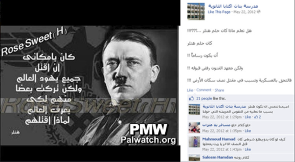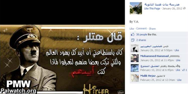 Finally, seeing Hitler as a positive figure is being passed on to Palestinian youth. Zayzafuna, a Palestinian children’s magazine funded by the PA, accepted for publication a submission by a 10th grade Palestinian girl which presented Hitler, not only as a positive figure, but one to be admired because he killed Jews in order to benefit all humanity.