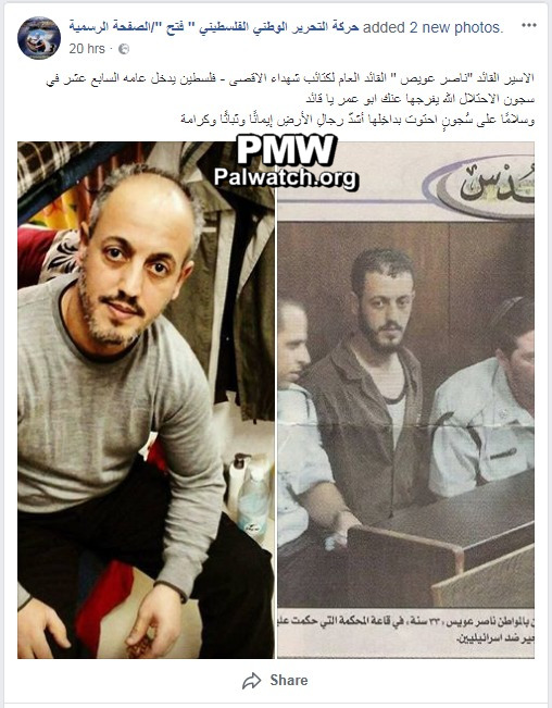 Posted text: “Prisoner commander Nasser Awais (i.e., terrorist, responsible for murder of 14), the general commander of the Al-Aqsa Martyrs’ Brigades (i.e., Fatah’s military wing) in Palestine, has begun his 17th year in the occupation’s prisons; may Allah release you, [Nasser Awais] Abu Omar, O commander, and blessings on prisons that contain within them the strongest men in the world in terms of faith, resolve, and honor”