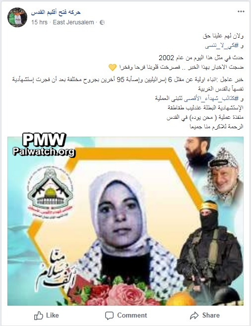 The image shows a picture of female suicide bomber Andalib Takatka, who murdered 6. She has a keffiyeh (Arab headdress) draped over her shoulders. On the poster are images of an armed masked man wearing a yellow Fatah headband, late PLO and PA Chairman Yasser Arafat and a third man. In the upper left corner is the logo of the Al-Aqsa Martyrs' Brigades (Fatah's military wing), which features a picture of the Al-Aqsa Mosque with assault rifles crossed above it, and the following text: "Fight them; Allah will punish them by your hands and will disgrace them and give you victory over them and satisfy the breasts of a believing people” [Quran, Sura 9:14, Sahih International translation].