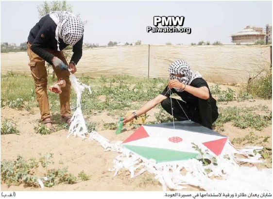 The article includes an image from the protests in which two masked rioters wearing keffiyehs (Arab headdresses) are seen preparing a kite in the colors of the Palestinian flag, and apparently attaching a firebomb to it.