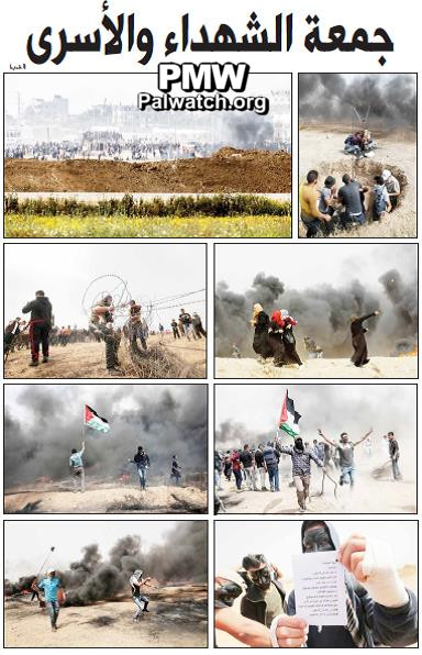 A full page of the official PA daily is dedicated to AFP pictures from the March of Return protests in Gaza, which show rioters throwing rocks and waving Palestinian flags on the Gaza border