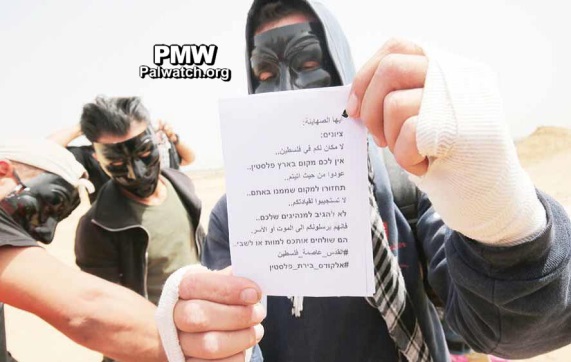 Official Palestinian Authority daily publishes full page of images from the Gaza “March of Return,” one of rioter holding up text “Zionists: You have no place in the land of Palestine Return to the place you came from”