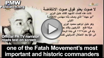Terrorist Abu Jihad (Khalil Al-Wazir) was a founder of Fatah and deputy to Yasser Arafat. He headed the PLO terror organization's military wing and also planned many deadly Fatah terror attacks in the 1960's - 1980's. These attacks, in which a total of 125 Israelis were murdered, included the most lethal in Israeli history - the hijacking of a bus and murder of 37 civilians, 12 of them children.During a broadcast on official PA TV, the newsreader praised Abu Jihad's "sacrifices and acts of heroism":