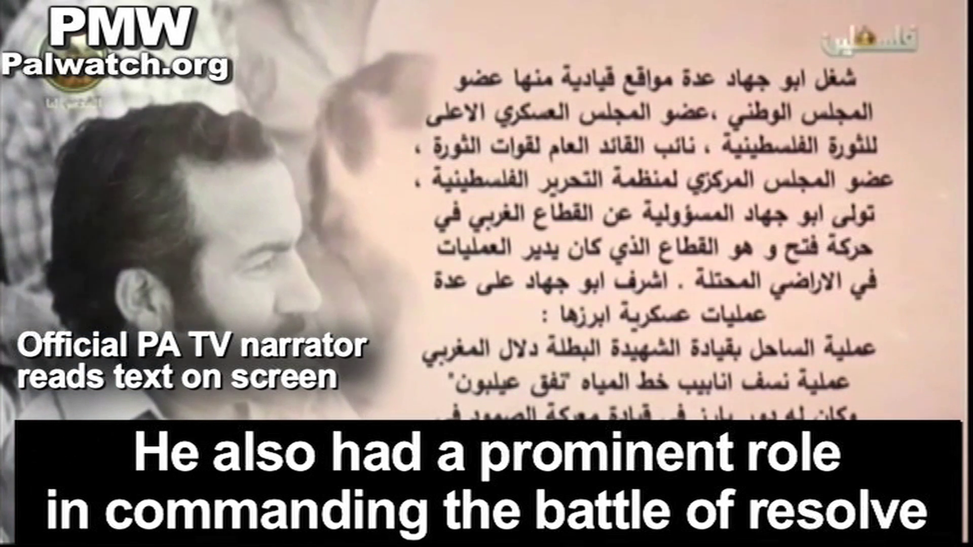 Throughout April, Abbas' Fatah Movement has honored and glorified terrorist Abu Jihad and his attacks, as reported by Palestinian Media Watch, whereas the PA Ministry of Education marked the anniversary with radio broadcasts about the terrorist in all PA schools.PA TV also honored terrorist Abu Jihad with a special filler between broadcasts. While different photos of Abu Jihad appear with text about him on the screen, a narrator reads the text, which lists some of his "prominent operations":