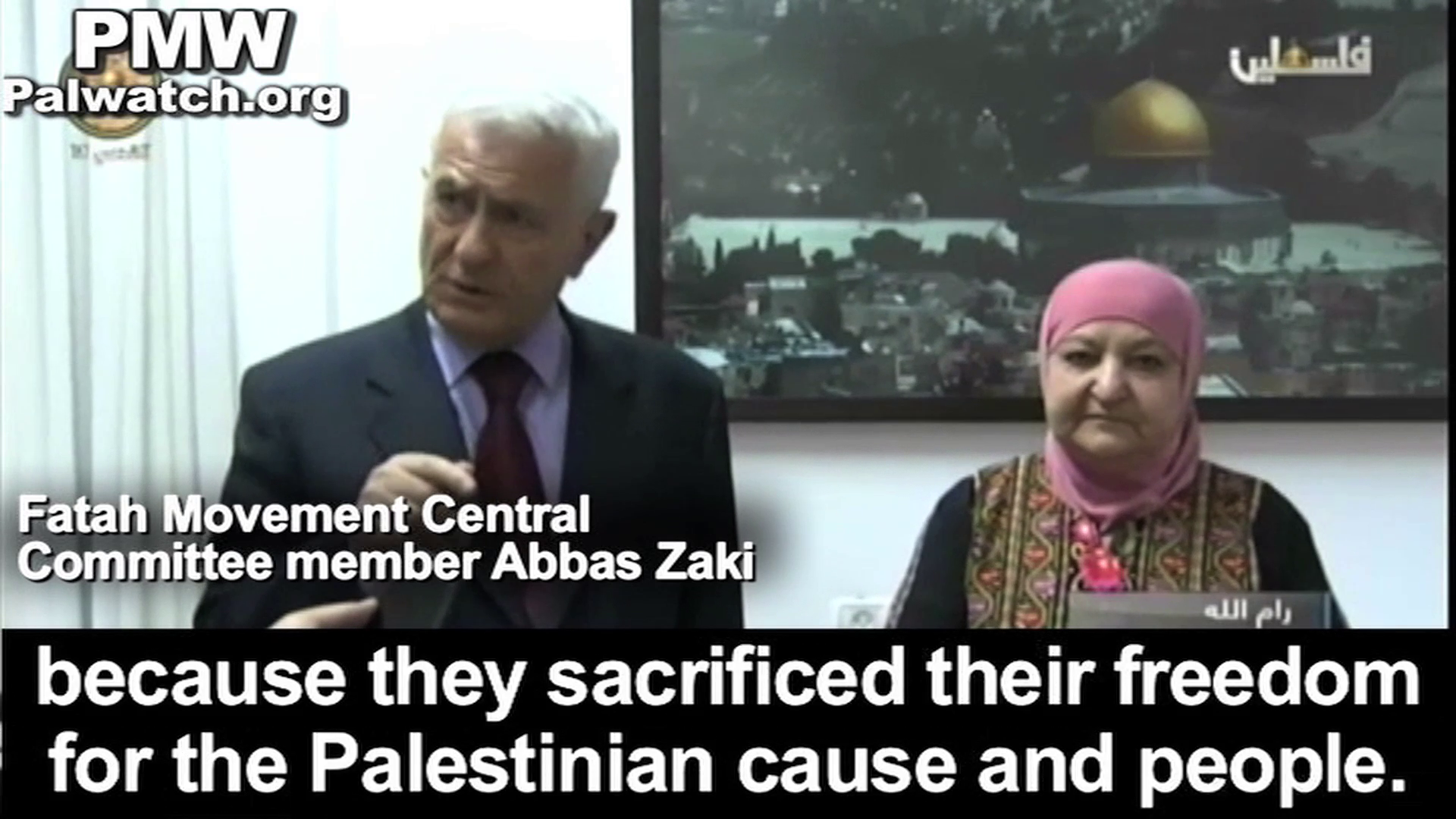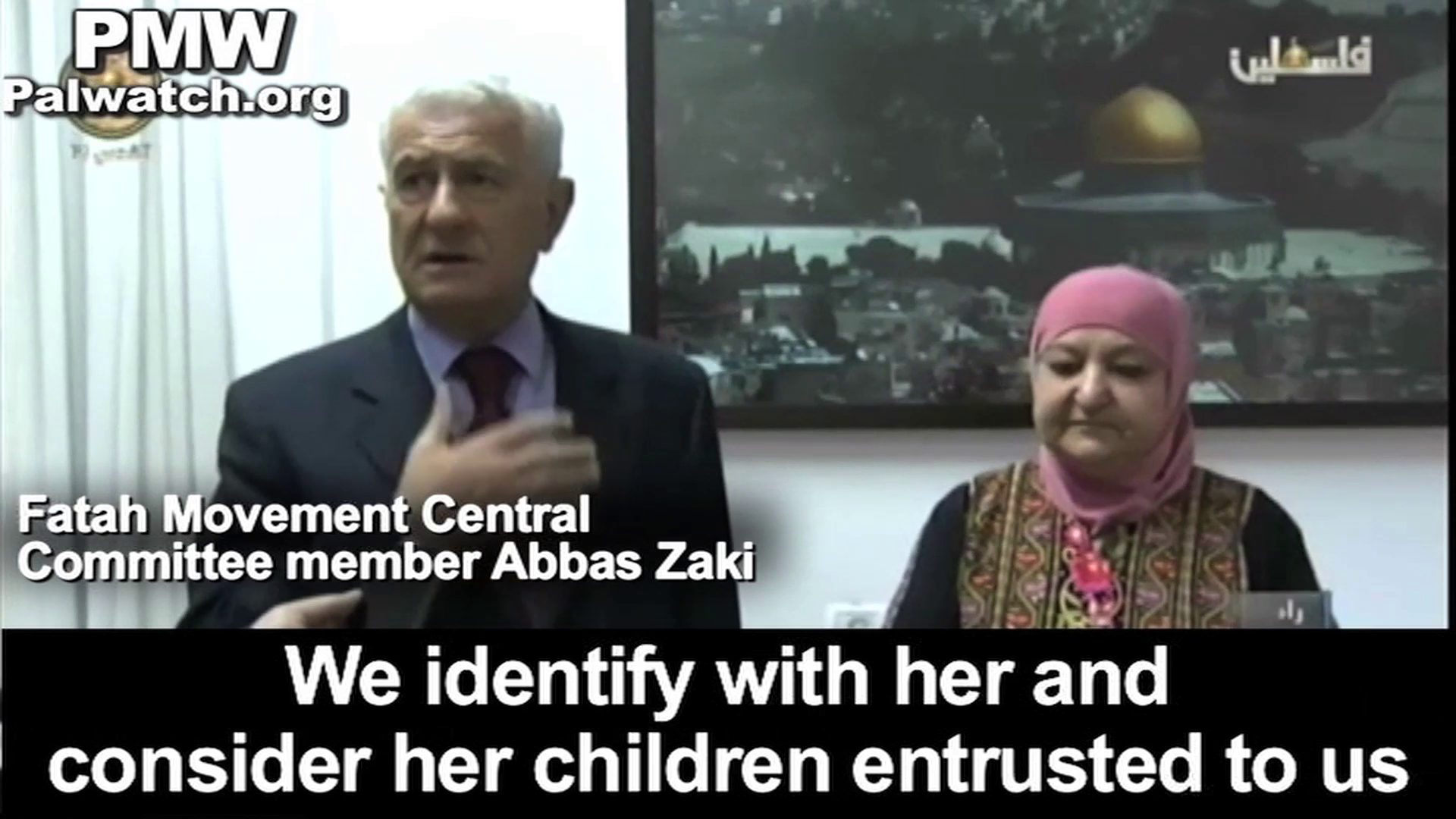 Palestinian Media Watch exposed that the PA chose Abu Hmeid to launch the PA's statehood campaign with the UN in 2011, and also honored her in 2010 and again in 2015. Recently, the official PA daily singled her out in a report on an event for mothers of "Martyrs."In its report, official PA TV News also included a statement by Fatah Central Committee member Abbas Zaki who, while standing with Abu Hmeid, praised her and her terrorist sons: