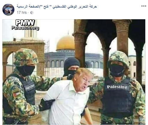 In anticipation of the ceremony today marking the opening of the American embassy in Jerusalem, which has been condemned by the Palestinian Authority, the official Facebook page of Mahmoud Abbas’ Fatah Movement posted the above photoshopped image of US President Donald Trump being “arrested” on the Temple Mount by soldiers of “Palestine.” [Official Fatah Facebook page, May 13, 2018]