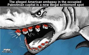 The image shows a shark with its mouth open, and instead of teeth it has rows of houses with red roofs, characteristic of Jewish towns in the West Bank. The sparkle in the shark’s eye is in the shape of a Star of David. Text on image in English: “The alleged American embassy in the occupied Palestinian capital is a new illegal settlement spot”