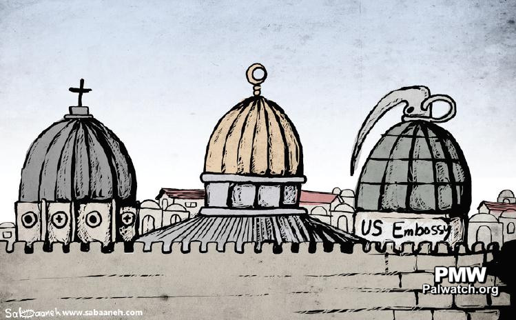 Cartoon in Palestinian Authority daily: New US embassy in Jerusalem is a hand grenade