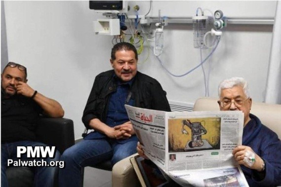 The day after the cartoon was published, a picture was taken of PA Chairman Mahmoud Abbas reading the official PA daily while hospitalized in Ramallah, and this cartoon was clearly visible on the back cover. This picture of Abbas has been widely disseminated in the media, possibly to show him being well after being hospitalized with pneumonia.