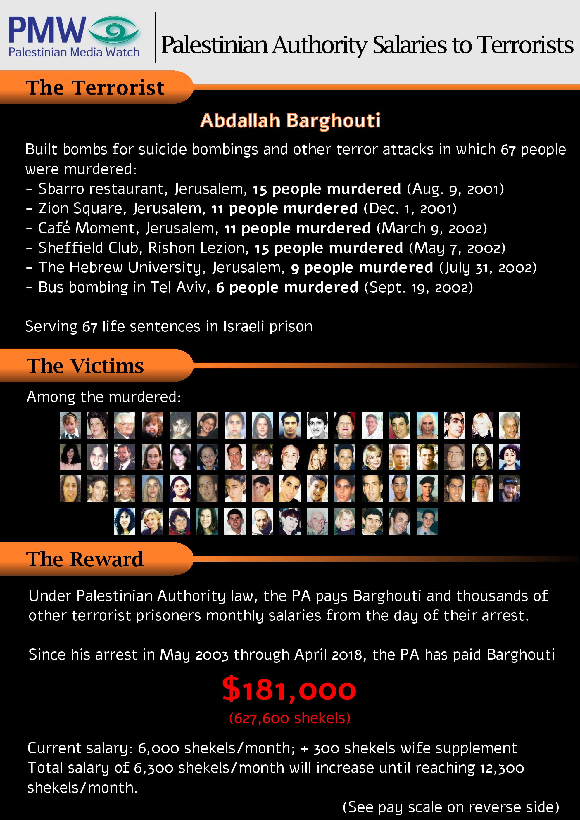 According to its 2018 budget, the PA allocated 550 million shekels ($158 million) for paying salaries to terrorist prisoners and released terrorists and an additional 687 million shekels ($197 million) for payments to families of the so-called "Martyrs" (including suicide bombers and other killed terrorists) and wounded.