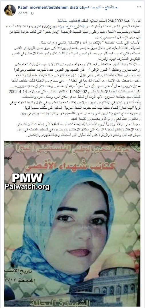 Emphasizing the message to Palestinians that “sacrificing” oneself for “Palestine” and dying as a “Martyr” while carrying out a terror attack against Israelis is an admirable act, the Bethlehem branch of Abbas’ Fatah Movement lauded the female suicide bomber Andalib Takatka, who murdered 6 when she carried out a suicide bombing in 2002.Posted text: "Sixteen years ago, on April 12, 2002, heroic self-sacrificing fighter Andalib Takatka carried out a self-sacrificing operation in occupied Jerusalem that led to the death of 6 Zionists and the wounding of another 85...
