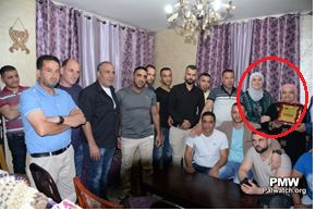 The two pictures show Um Nasser Abu Hmeid, mother of four terrorist prisoners and one terrorist "Martyr," on the right holding a plaque of honor given to her by visiting released prisoners from the Balata refugee camp. To the left of her is District Governor of Ramallah and El-Bireh Laila Ghannam. The men in the picture are the released prisoners from the Balata refugee camp.