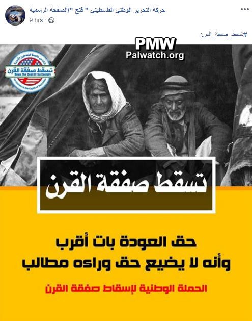 Official Fatah Facebook page posts image with the accompanying hashtag, “#Down_with_the_deal_of_the_century,” from the so-called “National Campaign to Thwart the Deal of the Century”