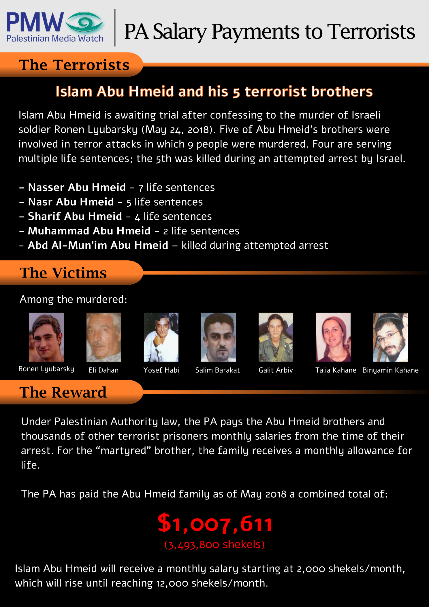 Nasser Abu Hmeid was a commander of the Al-Aqsa Martyrs' Brigades (Fatah's military wing) in Ramallah and is serving 7 life sentences for murdering 7 Israeli civilians and 12 attempted murders. The PA has paid him $251,917 (921,500 shekels). His current salary is 10,000 shekels/month.