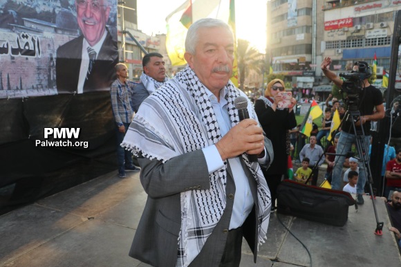 The image shows Mahmoud Al-Aloul giving a speech before Trump’s effigy is burned. In the background of the stage is a large poster showing PA Chairman Mahmoud Abbas and the Temple Mount.