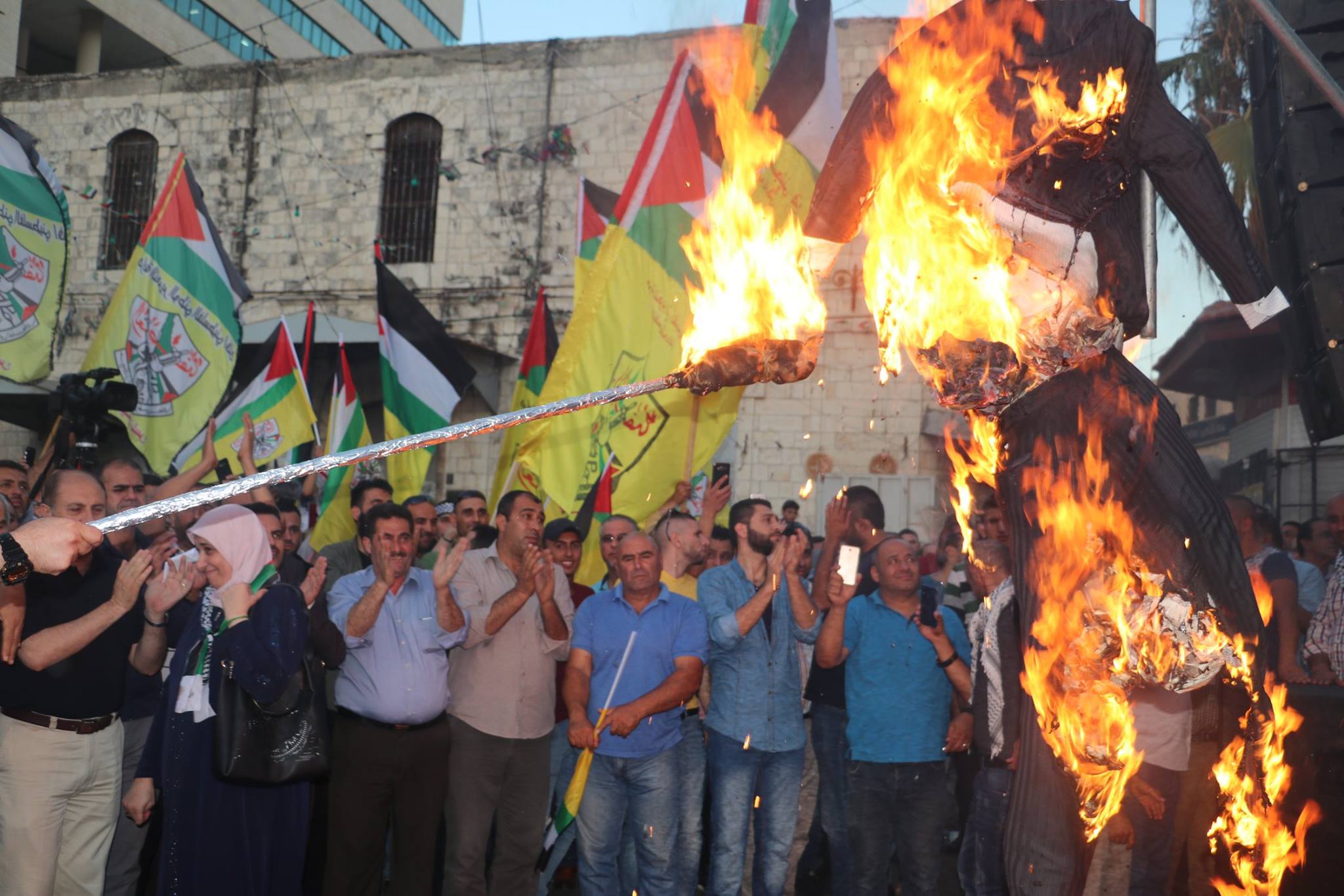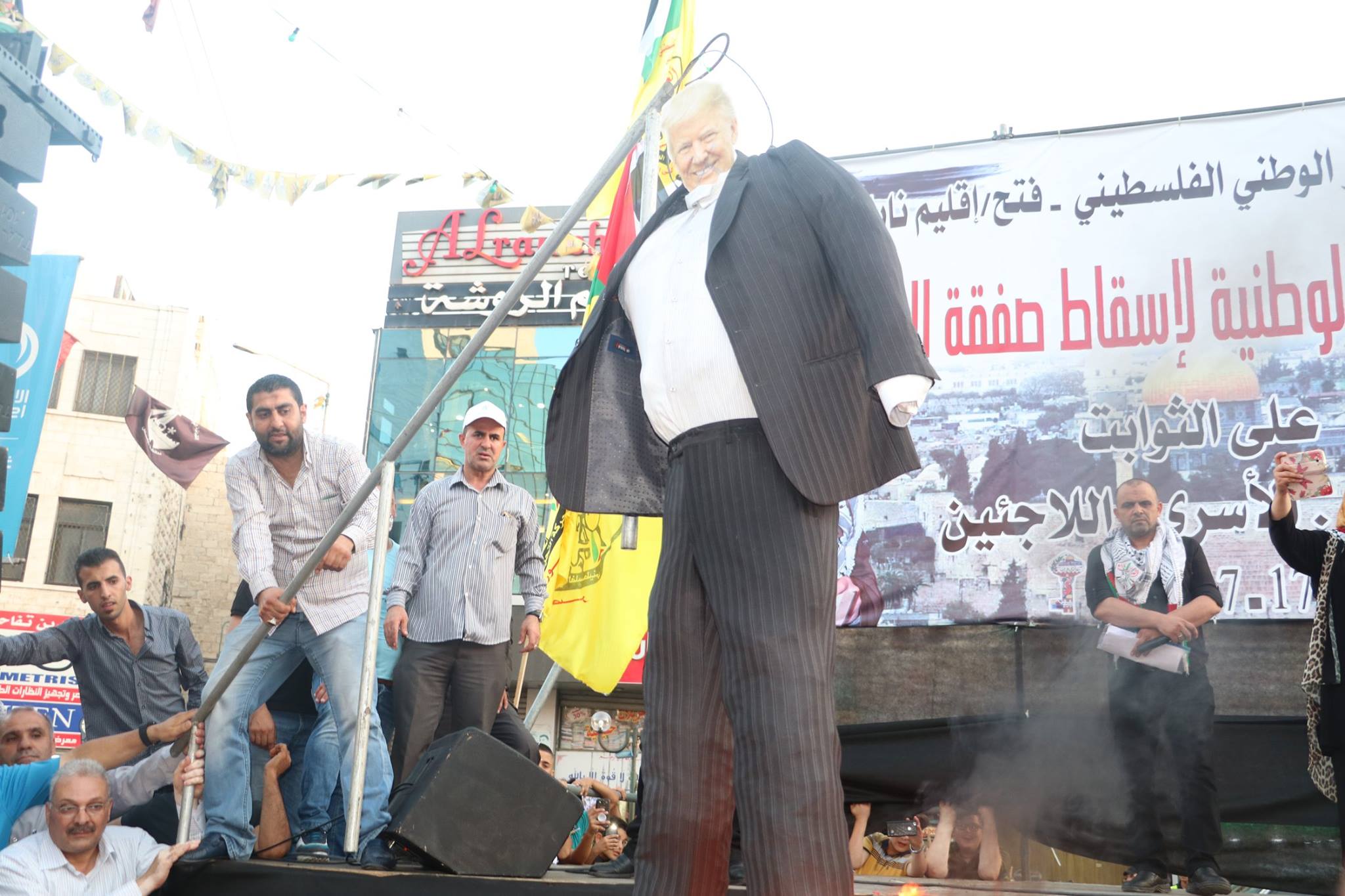 Cheering Palestinians hang and burn effigy of Donald Trump
