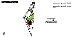 The cartoon shows the PA map of “Palestine” that presents all of Israel as “Palestine” together with the PA areas. The drawings over the map show a man wearing an Arab headdress with an ammunition belt across his chest holding a rifle in one hand while embracing the Dome of the Rock with the other, and at the bottom is what appears to be the back of a girl’s head with a key symbolizing the “right of return” attached to the end of her braid.