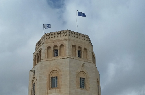 The picture shows the Israeli flag that flies over the tower of the Rockefeller Museum in Jerusalem.