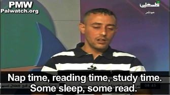 Released terrorist prisoner Muhammad Hilal: "In the morning we'd exercise from 7:00 until 8:00... Then the guys would get together in the prison yard and we'd chat, talk, eat, drink, joke and play, etc., throughout the day. At noon the guys would go to their rooms for roll-call. Noon roll-call is from 11:00 a.m. until 1:30 p.m. Roll-call time is time for resting in the rooms. Each group has a routine inside the rooms: Nap time, reading time, study time. Some sleep, some read. At 1:30 or 12:30 p.m. they'd take us out to the yard again. We'd spend [time] with the guys walking, laughing, playing, joking, etc., until dark. Then back to the rooms. They'd lock us up until 6:00 a.m., roll-call time."