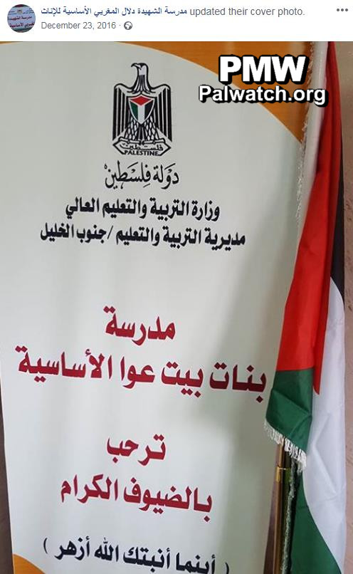 The picture is the new cover and profile picture of the Facebook page of the Martyr (Shahida) Dalal Mughrabi Elementary School for Girls (i.e., terrorist who led murder of 37, 12 of them children), and shows a sign with the following text, proving the school's name was changed from the Beit Awwa Elementary School for Girls: