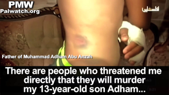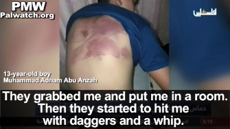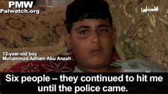 13-year-old boy Muhammad Adham Abu Anzah: "They grabbed me and put me in a room. Then they started to hit me with daggers and a whip. He broke my finger. I demand justice. When one finished or tired out, another came and continued to hit me with a belt. They broke iron on my neck. Six people - they continued to hit me until the police came. Afterwards, the police arrested me. Later, my father came and started to shout at them, and then they released me."