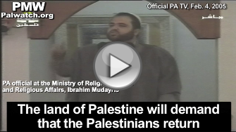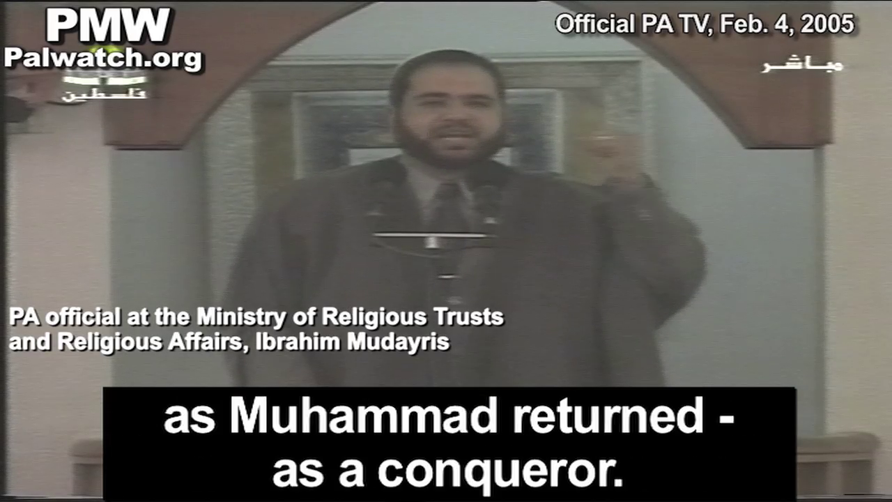 "We might return to the 1967 borders by diplomacy, but we shall not return to the 1948 borders [i.e. eliminate Israel] by diplomacy. The 1948 borders- no one on earth recognizes as ours. Therefore we shall return to the 1967 borders, but we have not given up on [Israeli cities] Jerusalem and Haifa, Jaffa, Lod, Ramle and Tel Aviv... The land of Palestine will demand the Palestinians return as Muhammad returned- as a conqueror."