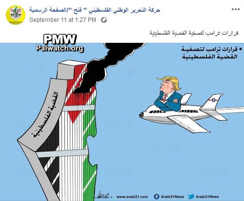 The cartoon shows US President Donald Trump about to fly a plane into a building shaped like the PA map of "Palestine" that presents all of Israel as "Palestine" together with the PA areas. The building is painted in the colors of the Palestinian flag and smoke is already rising from it.