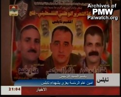 PA TV focused on the Fatah poster (above) honoring the three terrorists. The following is the text on the poster with pictures of the terrorists: