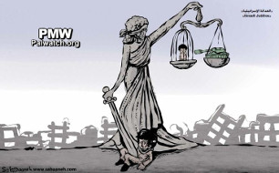 Text on cartoon in Arabic and English: “Israeli Justice”