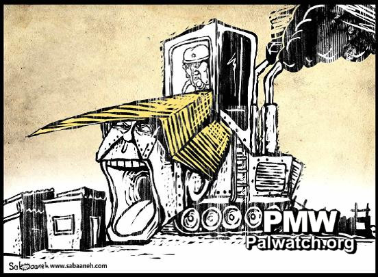 The same claim, that Trump is controlled by Israel, is expressed in this cartoon where Trump is a bulldozer driven by an Israeli soldier with a Star of David on his helmet. The Trumpdozer is approaching some shacks, about to devour them. [Official PA daily Al-Hayat Al-Jadida, Sept. 22, 2018]