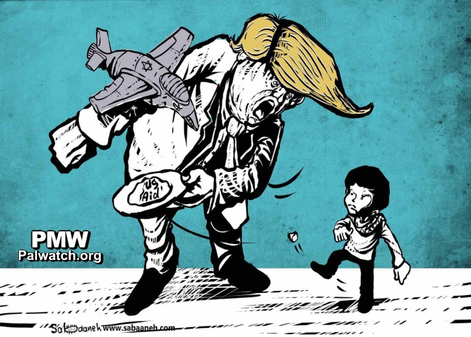 Earlier this week, this cartoon showed Trump snatching away US aid from a small Palestinian kid, who defiantly kicks a stone at Trump. On Trump's arm is a bird in the shape of an Israeli military jet with a Star of David on it. [Official PA daily Al-Hayat Al-Jadida, Oct. 10, 2018] The cartoon refers the US decision to stop providing funding to UNRWA (UN Relief and Works Agency for Palestine Refugees in the Near East).