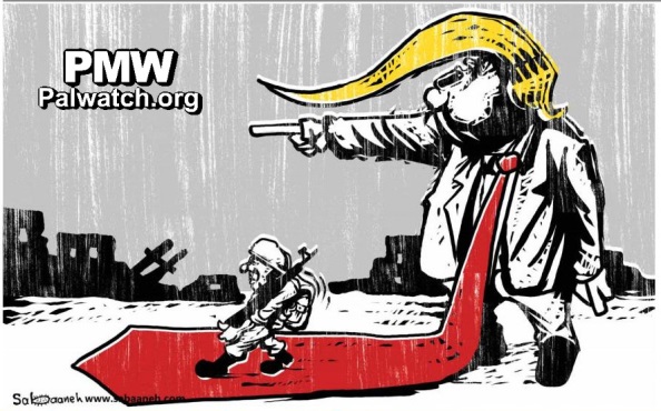 On the anniversary of the 9/11 terror attack, the PA daily mocked Trump in a cartoon that showed him flying into a building shaped as the PA's map of "Palestine," which includes all of Israel and the PA areas.